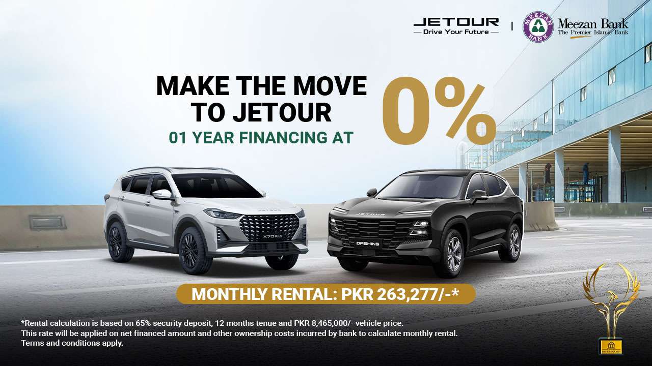 Jetour Pakistan partners with Meezan Bank to offer exclusive 0% Islamic auto financing on Jetour Dashing and X70 Plus for a limited time. Enjoy transparent, Shariah-compliant ownership with easy monthly rentals through Jetour’s nationwide dealerships. Limited time Offer.